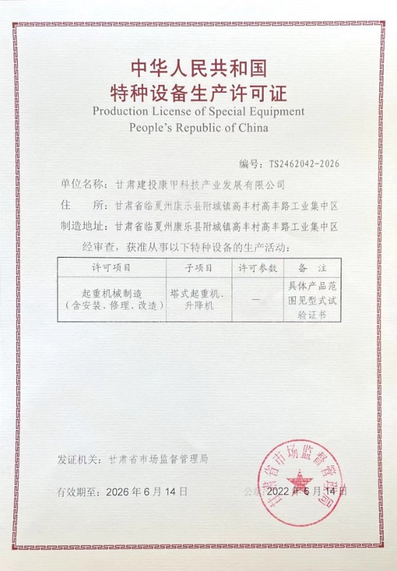 此次取證工作自2022年3月底開始至今,裝備公司在人員、技術、設備、原材料等方面為康甲公司提供了全面支持,為取得特種設備生產許可奠定了基礎。康甲公司各部門通力協作,完成質量保證體系建設,并嚴格按照質量保證體系要求完成塔式起重機和施工升降機的試生產,專家組從資源條件、體系運行、試生產等三個方面進行了評審,經甘肅省市場監督管理局復核相關資料,按照相關法律法規決定授予康甲公司特種設備生產許可證。