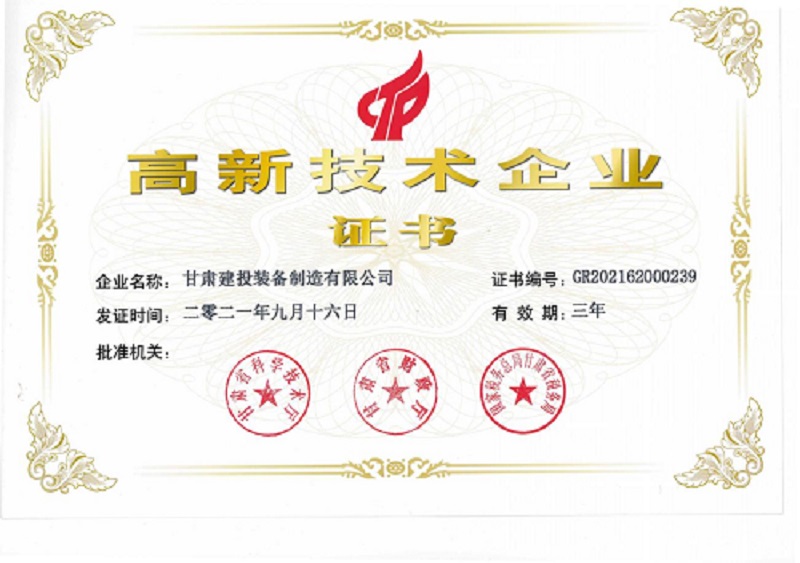 甘肅建投裝備制造有限公司被評為國家級高新技術(shù)企業(yè)
