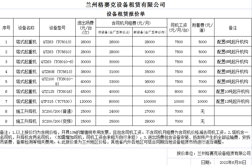 甘肅建投裝備制造有限公司設(shè)備租賃報價單(建投內(nèi)部)