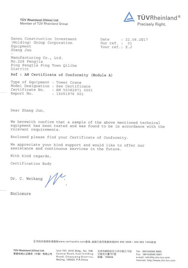 甘肅建投裝備制造有限公司生產(chǎn)的高漠牌塔式起重機QTZ63(TC5013)于2017年8月22日通過了歐盟關(guān)于產(chǎn)品樣機和資料的審核,取得了由德國萊茵TüV集團(Notified Body number:0035)頒發(fā)的CE證書,證書編號為:AM 50382971 0001。